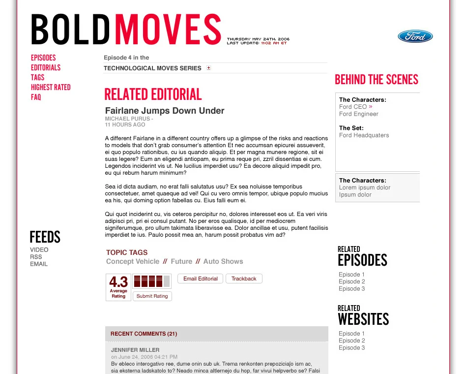 “Bold Moves: The Future of Ford” was an online documentary series that showed “the inner-workings of the automaker" as it rebuilt its business in North America. It was a 30-part series that gave inside access to never-before-seen properties of Ford — including executive offices, design studios and assembly plants.